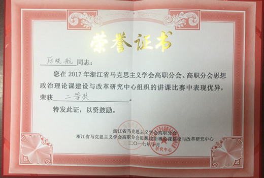 近日,浙江省高职高专院校思想政治理论课教师教学技能大赛在金华职业技术学院举行。我院思政教研室教师厉晓航获省高职高专院校思想政治理论课教师教学技能大赛二等奖。