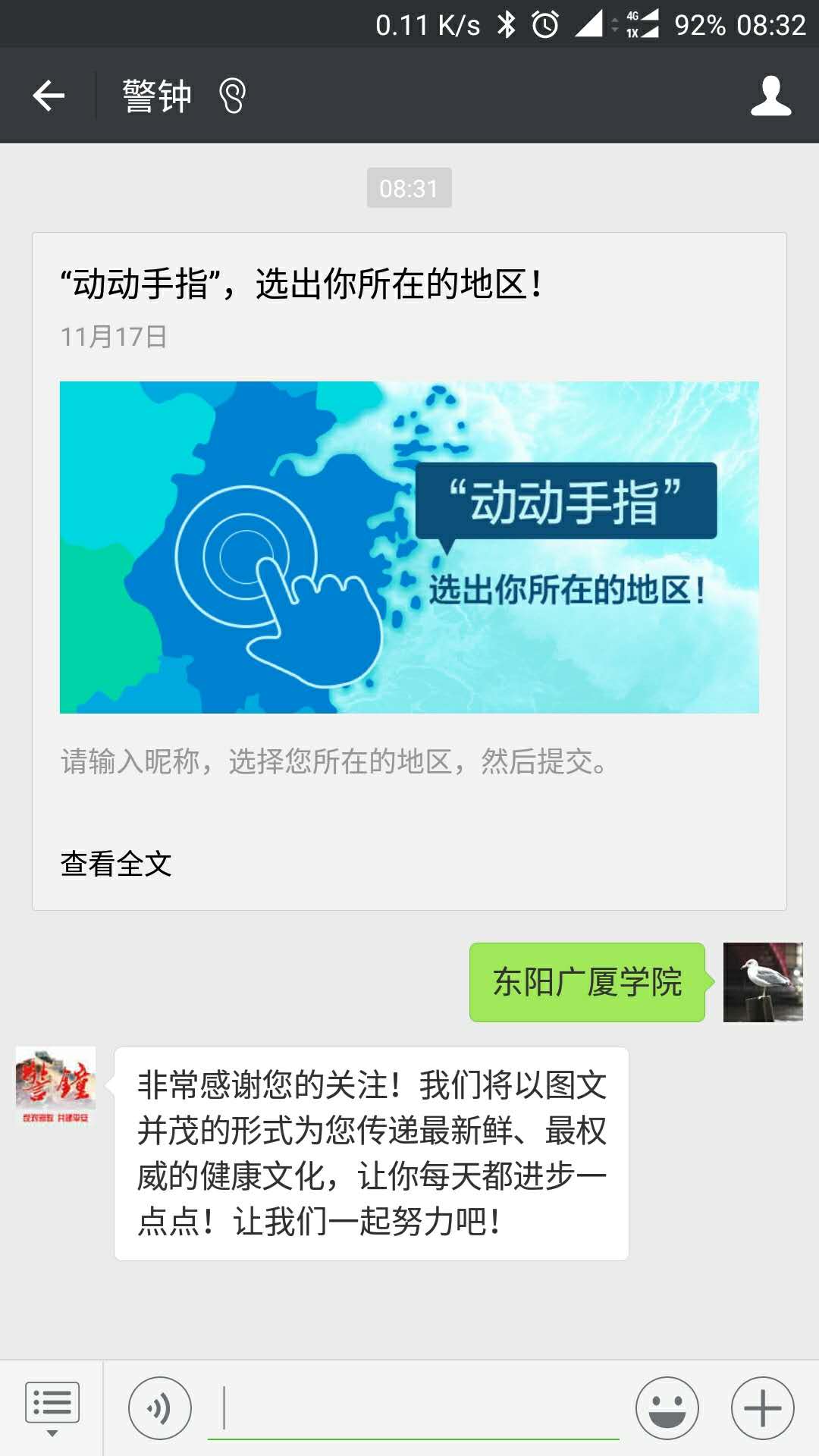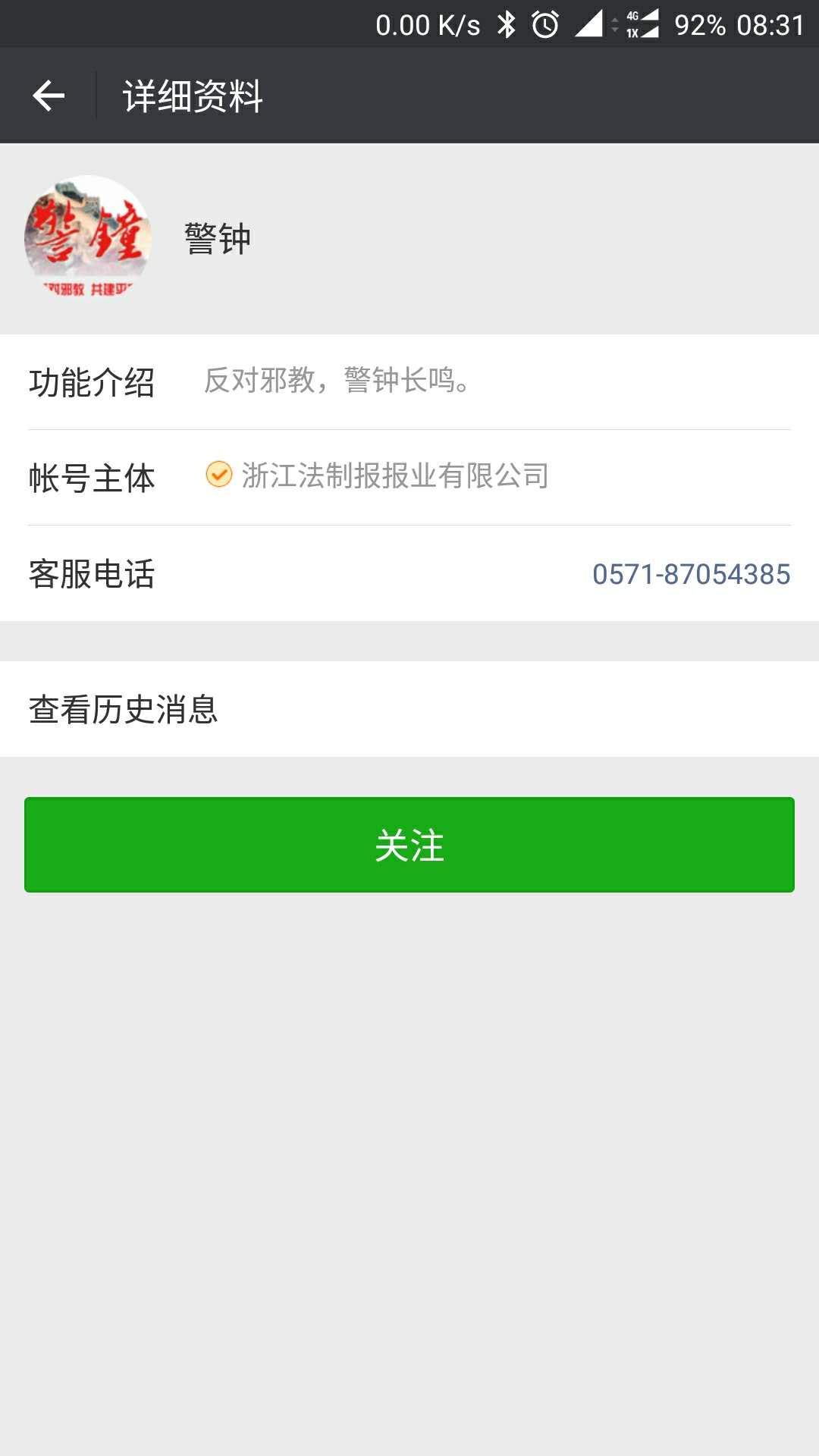 “反对邪教,警钟长鸣”请师生一起来关注警钟 来源: 作者: 发布时间:2017-11-17 浏览次数: 次 【字体:小 大】 “反对邪教,警钟长鸣”请师生一起来关注警钟。 “警钟”微信公众号关注流程: 1、登录微信,点击通讯录,点击公众号,点击添加,输入“zjjingzhong”或“警钟”,点击关注或扫一扫微信二维码关注。2、关注成功后,在留言栏输入“东阳广厦学院”,便于后台查询关注的归属地(此项操作很重要)。 或 打开微信点击添加 点击添加朋友 输入 选择警钟 点击关注 终审:党建思政 【打印正文】 相关信息