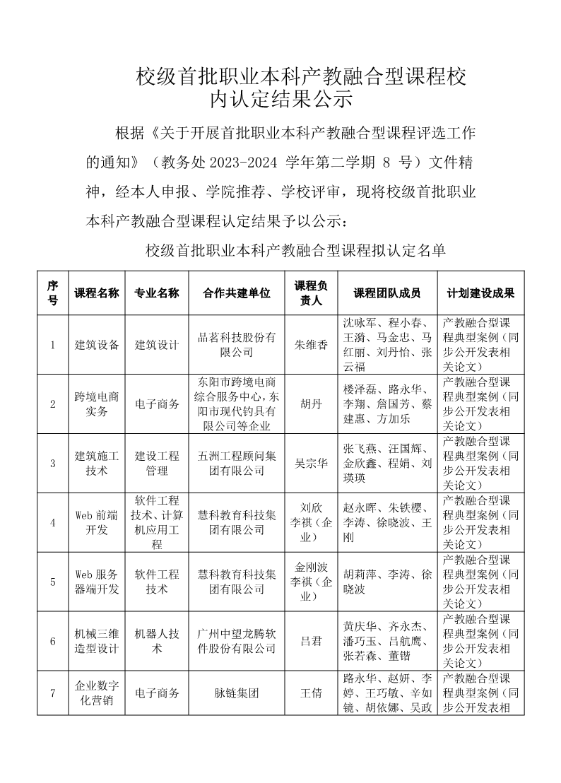 校级首批职业本科产教融合型课程校内认定结果公示